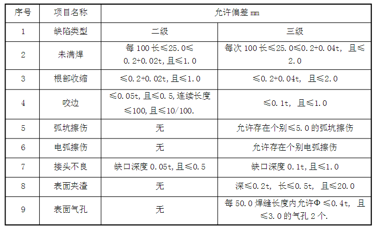 5、鋼結(jié)構(gòu)焊接:焊條、焊絲、焊劑等焊接材料與母材的匹配應(yīng)符合設(shè)計(jì)要求及現(xiàn)行行業(yè).標(biāo)準(zhǔn).《建筑鋼結(jié)構(gòu)焊接技術(shù)規(guī)程》JGJ81 的規(guī)定,焊條、焊絲、焊劑在使用前按其說(shuō)明書(shū)及焊接工藝的規(guī)定進(jìn)行烘焙和存放。焊工須持證上崗,在其認(rèn)可范圍內(nèi)施焊,焊接時(shí)采用合理的焊接工藝,以減少由焊接產(chǎn)生的變形和應(yīng)力,確保焊縫和構(gòu)件的質(zhì)量。本工程零部件連接處均需滿(mǎn)焊,焊縫厚度按設(shè)計(jì)要求,焊接時(shí),盡量減少接縫數(shù)量,拼接應(yīng)按等強(qiáng)度連接原則,選擇合適的焊接工藝和剖口形式,并設(shè)置在預(yù)應(yīng)力較小部位,焊縫表面不得有裂紋、焊瘤等缺陷,表面無(wú)氣孔、夾渣、弧坑、電弧擦傷等缺陷,焊縫不得有咬邊,未焊滿(mǎn)根部收縮等缺陷,力求做到外形均勻,成型較好,焊縫與焊縫,焊縫與基層過(guò)渡平滑,焊渣和飛濺物須清理干凈,二、三級(jí)焊縫處外觀(guān)質(zhì)量標(biāo)準(zhǔn)見(jiàn)下表: